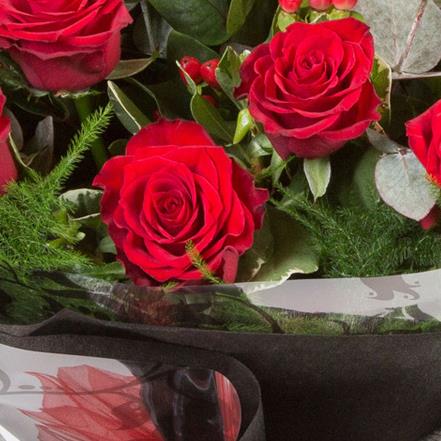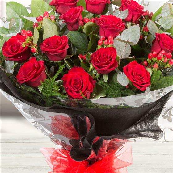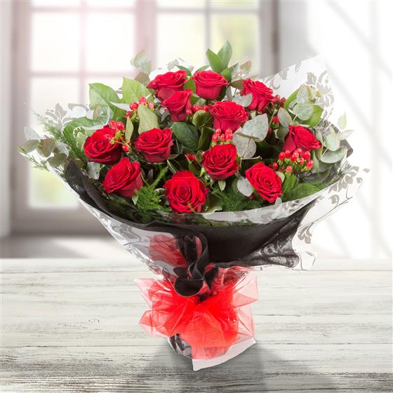 12 long stemmed velvety red roses mingled with mixed foliage and hypericum berries, presented with a complementary wrap.