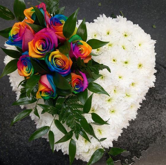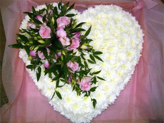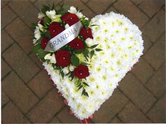 Florist choice closed heart, massed in white chrysanthemums with a corsage of your colour choosing. These tributes are lovingly and thoughtfully made with fresh seasonal flowers. Specially crafted in any style by our florists ensuring that tributes honour and respect the memory of your loved one, made personal where possible. Starting at 10". Select your size and corsage colour way.