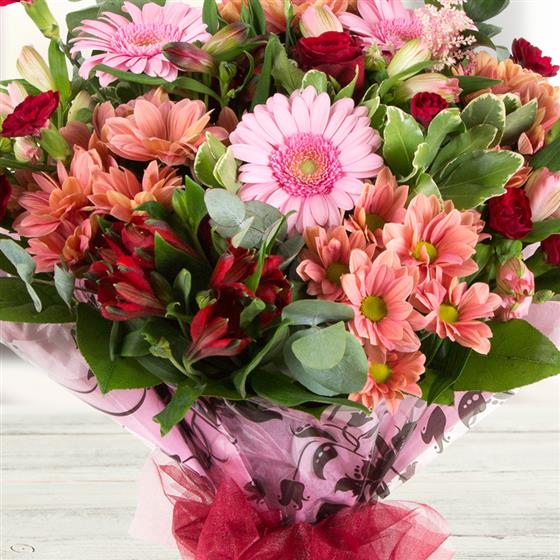A hand-tied bouquet in a variety of deep red and pink shades encasing a single, long stemmed red rose.