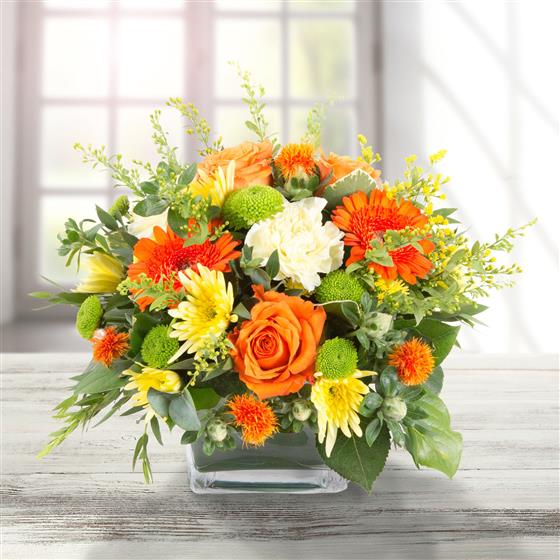 A delightful, compact cube arrangement in shades of orange and yellow with a touch of lime.