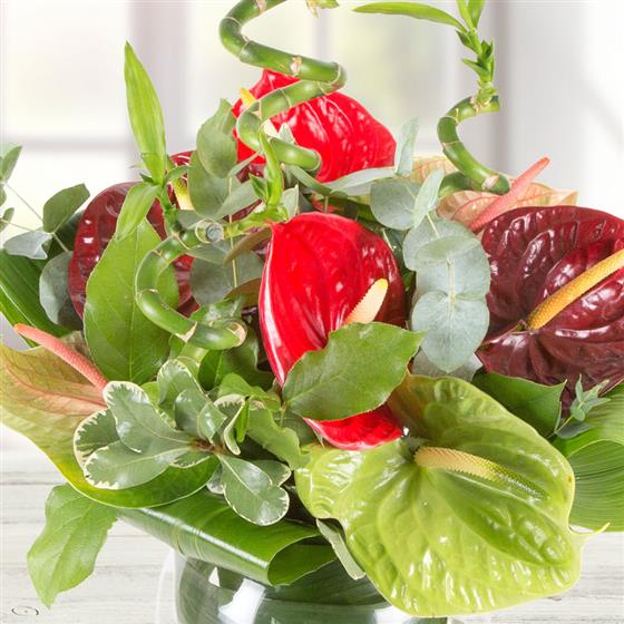 An extra special gift of long lasting mixed anthuriums, bamboo and foliage presented in a glass bowl.