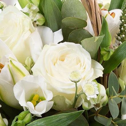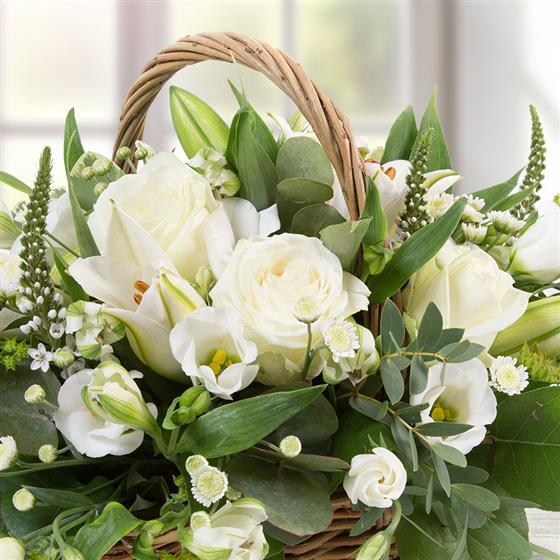 A crisp collection of white blooms including roses, lilies, lisianthus and alstromeria arranged in a rustic basket.